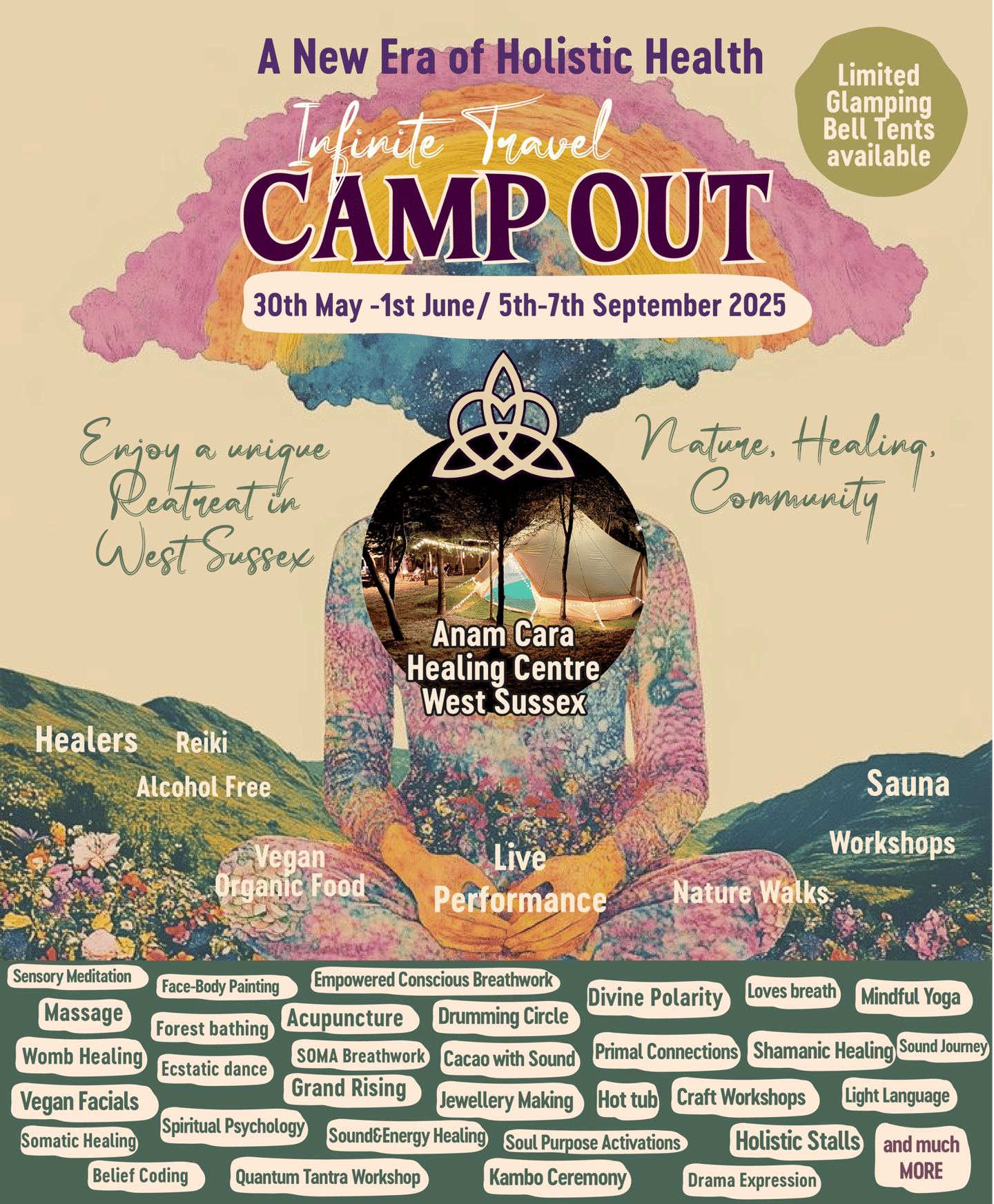Enjoy a unique Retreat Camp Out at Anam Cara Healing Centre in West Sussex. We welcome you to a celebration of starlight and connection.